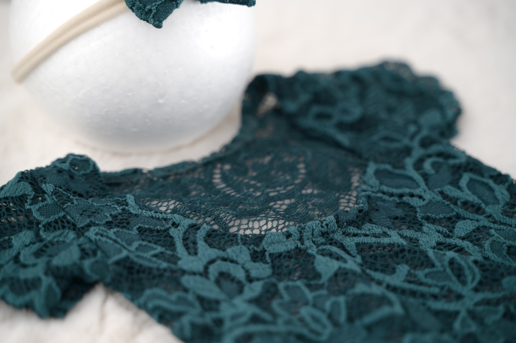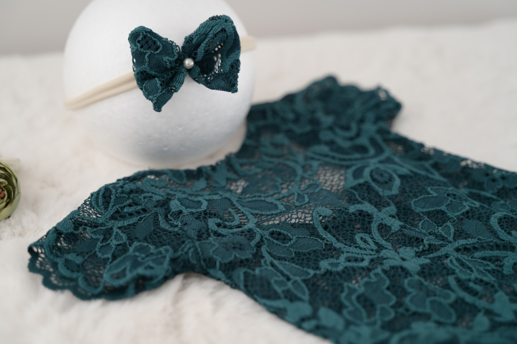 Mélyzöld rövid ujjú csipke body fejpánttal újszülött fotózáshoz